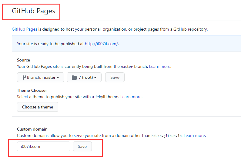 - 在Custom domain项中输入域名:i007it.com后,Save保存一下。