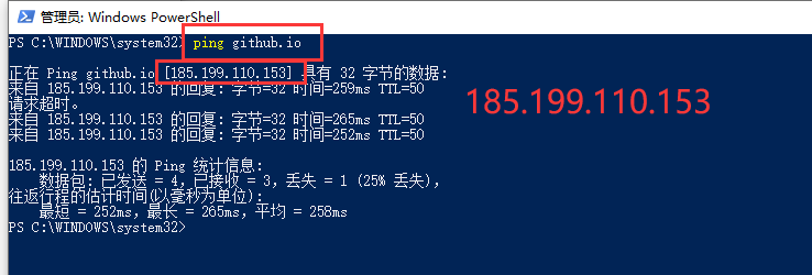 1).先通过ping github.io 命令,得到对应的ip地址为:185.199.110.153 (不固定,需要自己ping一下)