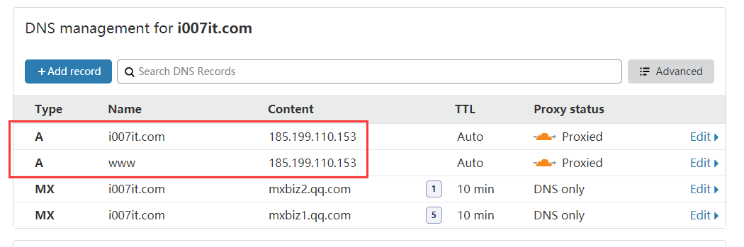 2).当域名解析(DNS)服务商中的A记录对应ip地址设置为上面ping出来的ip地址。