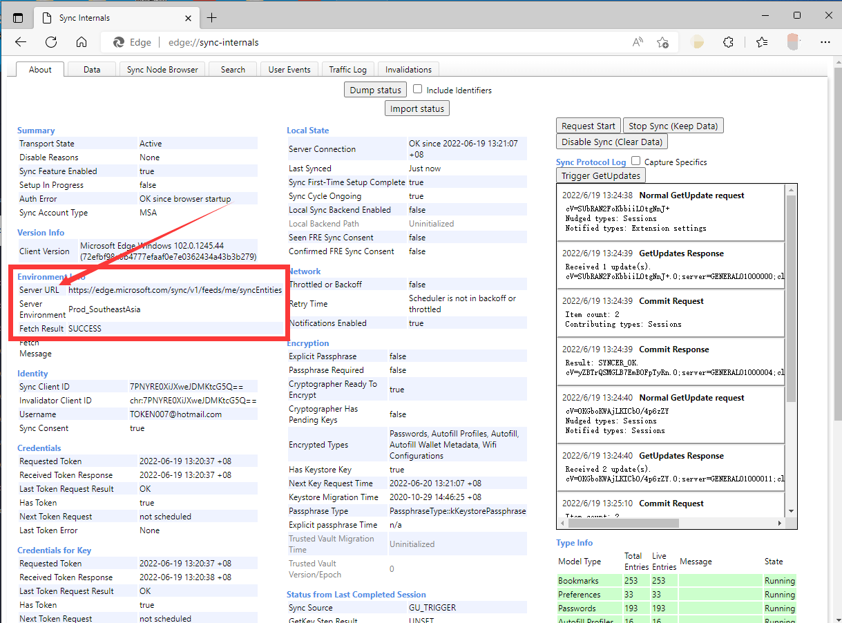 再打开edge://sync-internals/,如果可看到Server URL中有数值,说明可以正常同步。