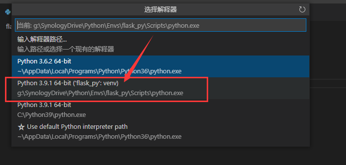 选择创建的虚拟环境目录下的,即:G:\SynologyDrive\Python\Envs\flask_py\Scriptes\python.exe
