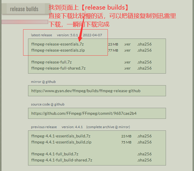 页面上的都可以下载,比如我这直接下载【release builds】中的 ffmpeg-release-essentials.7z,目前最新的版本。如下图所示: