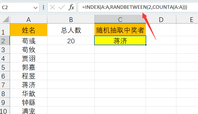 最终使用的公式是:=INDEX(A:A,RANDBETWEEN(2,COUNTA(A:A))),结果如下图所示: